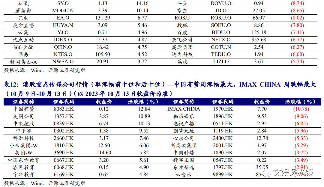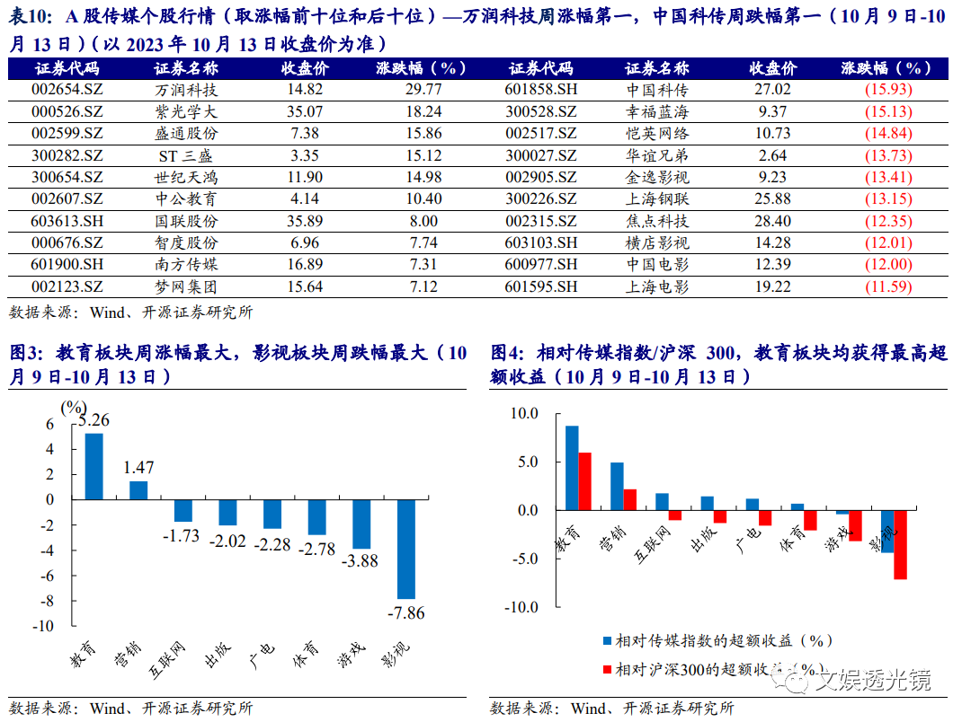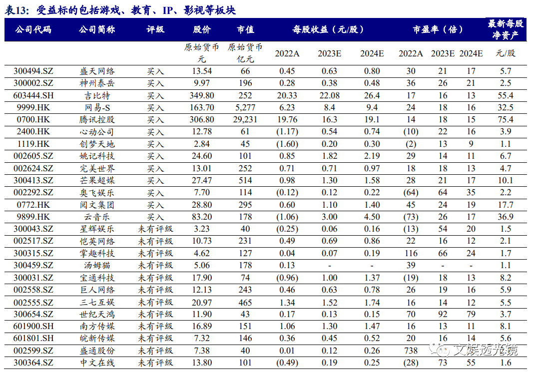 10月12日,汉王科技发布汉王天地大模型,针对古文、政法、教育、办公等多个行业应用落地了古汉语大模型、法律大模型、教育大模型、办公大模型等;10月15日,中文在线发布全球首个万字创作大模型“中文逍遥大模型”,可实现一键生成万字,一张图写出一部小说,一次读懂100万字小说,为创作者提供全创作周期的智能辅助;此外,世纪天鸿AI助教工具“小鸿助教”在微信公众号宣布优化了“教案生成、作文批改”2个经典场景及新增“文章写作、文本润色、PPT大纲、思维导出、教师评语、中英互译”6大办公场景。我们看到,在OpenAI于9月下旬宣布ChatGPT实现联网及支持图片、语音交流及与文字互转等多模态更新后,10月国内AI大模型和行业应用亦不断升级;后续随着AI大模型进一步朝多模态方向升级,在游戏、社交、教育、IP开发等领域应用落地带来的商业化增量空间或不断打开,建议继续前瞻布局“AIGC+游戏/教育/IP”。(1)游戏:作为集合了文字、图像、声音、视频等多种内容形式的应用,或将更受益于多模态模型带来的研发效率提高及内容、玩法丰富度提升,AI生成能力的提升亦将使得游戏的社交属性更加突出,从而吸引增量用户进入,并通过增加付费点提升商业化能力;国产游戏版号的持续稳定发放有利于新品供给持续释放,而版号数量的限制有利于游戏公司聚焦精品,从而提高单产品生命周期,对板块业绩和估值形成支撑。重点推荐盛天网络、神州泰岳、吉比特、网易-S、腾讯控股、心动公司、创梦天地、姚记科技、完美世界,受益标的包括星辉娱乐、恺英网络、掌趣科技、汤姆猫、宝通科技、巨人网络、三七互娱等。(2)教育:世纪天鸿 AI 助教产品“小鸿助教”不断升级,教育出版公司的“AI+教育”产品有望持续落地;受益标的包括世纪天鸿、南方传媒、皖新传媒、盛通股份等。(3)影视及IP开发:监管政策对数据版权的规定或驱动大模型训练对数据资源的需求持续提升,IP储备丰富的公司在多模态模型训练过程中或衍生全新商业模式,而多模态模型的推出或驱动动画、影视、VR/AR内容开发提速;重点推荐芒果超媒、奥飞娱乐、阅文集团、云音乐,受益标的包括中文在线、上海电影、掌阅科技、捷成股份、华策影视、天娱数科等。
