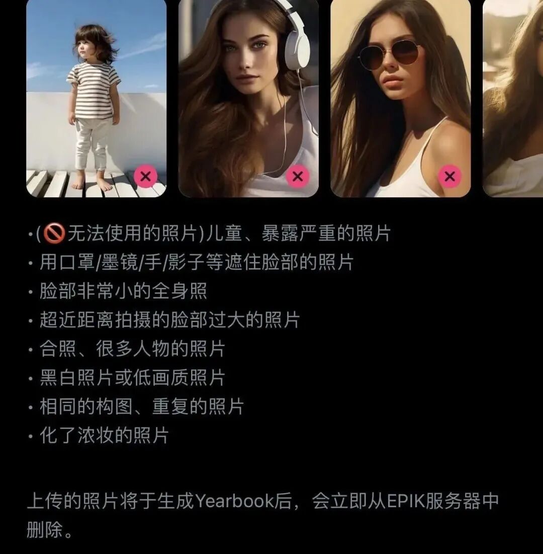 EPIK 倒是足够敏锐,它无法上传儿童的照片,以及在 AI 生成了图片之后,之前上传的图片就会从服务器删除。