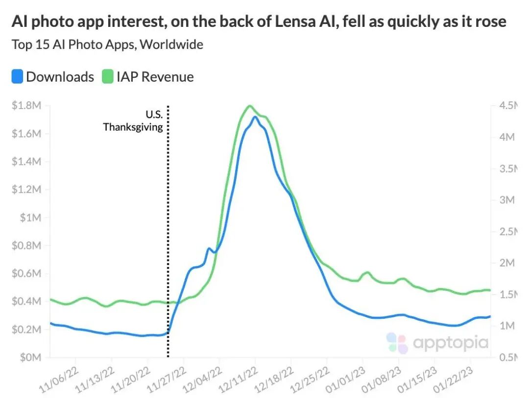 今年 2 月,数据分析公司 Apptopia 的调查发现,消费者对 AI 照片应用的兴趣,来得快去得也快。从图表上来看,这就像一座陡峭的山峰,登顶只在一瞬间。