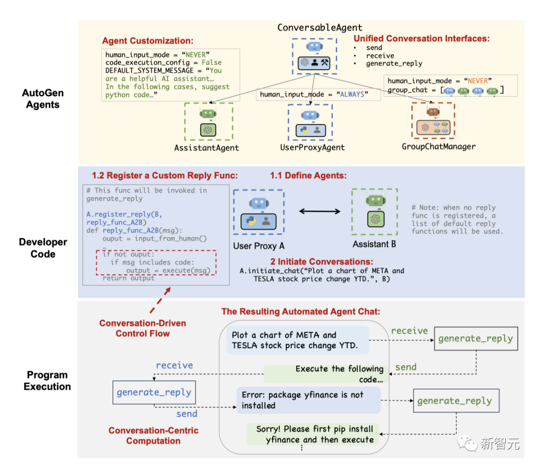 中间的子图展示了使用AutoGen开发具有自定义回复功能的「双智能体系统」的示例。底部的子图展示了程序执行期间,「双智能体系统」产生的自动智能体聊天。
