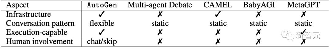 最后,研究人员还拿当前流行的智能体进行了对比,AutoGen的优势在于能够构建基础设施,允许灵活的对话模式,能够执行LLM生成的代码。