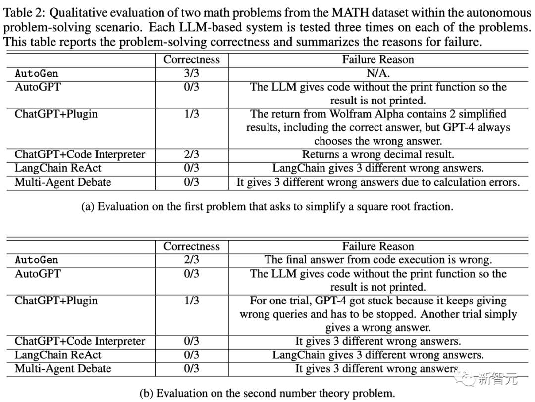 在自主解决数学问题上,研究人员通过AutoGen与AutoGPT、ChatGPT+Plugin、ChatGPT+Code Interpreter等进行了定性和定量评估。