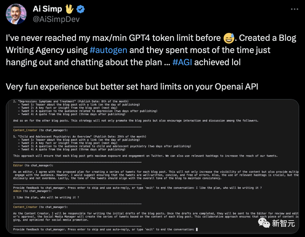 有网友通过AutoGen创建了一个「博客写作智能体」,并且还没有超过GPT4的最大/最小token限制。