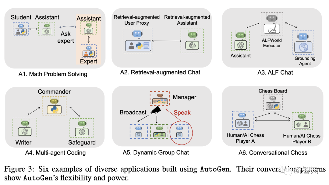 根据技术报告,给出了通过AutoGen6个应用的构建,可以解决数学问题,检索增强型聊天、ALF聊天、多智能体编码、动态群组聊天、国际象棋对弈。