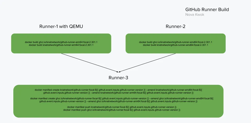 第一阶段同时开两个 Runner 分别构建 knatnetwork/github-runner-amd64:focal-2.301.1 和 knatnetwork/github-runner-arm64:focal-2.301.1 的镜像 在上面两个 Runner 完成之后通过操作 manifest 的方式合并为一个叫 knatnetwork/github-runner:focal-2.301.1 的 Multi-Arch 镜像