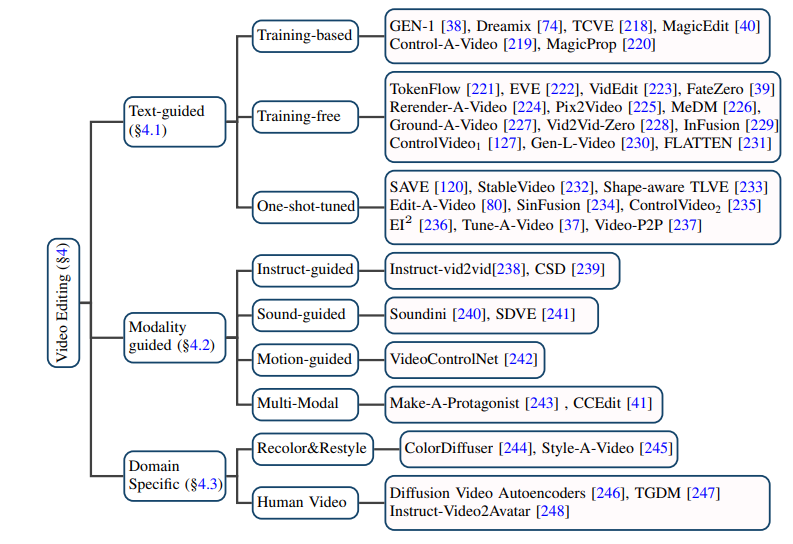 基于文本的视频编辑:考虑到现有文本 - 视频数据规模有限,目前大多数基于文本的视频编辑任务都倾向于利用预训练的 T2I 模型,在此基础上解决视频帧的连贯性和语义不一致性等问题。作者进一步将此类任务细分为基于训练的(training-based)、无需训练的(training-free)和一次性调优的(one-shot tuned)方法,分别加以总结。