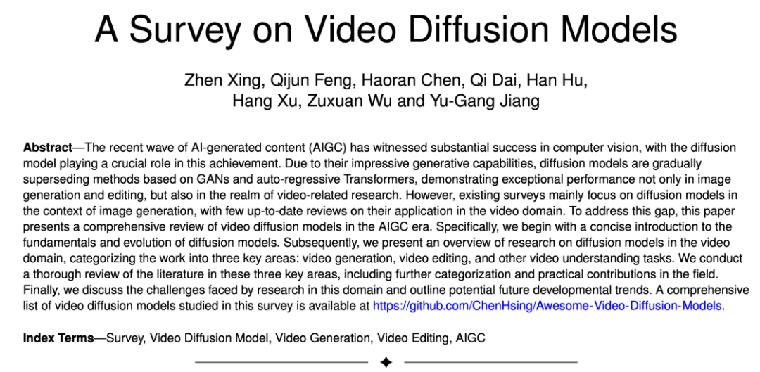 近期,复旦大学视觉与学习实验室联合微软、华为等学术机构发布了首个关于扩散模型在视频任务工作的综述,系统梳理了扩散模型在视频生成、视频编辑以及视频理解等方向的学术前沿成果。
