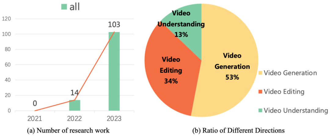 这些研究工作引领着视频生成和编辑技术的发展方向。研究数据显示,自从 2022 年以来,关于扩散模型在视频任务上的研究工作呈现出爆炸式增长的态势。这种趋势不仅体现了视频扩散模型在学术界和工业界的受欢迎程度,同时也凸显了该领域的研究者们对于视频生成技术不断突破和创新的迫切需求。