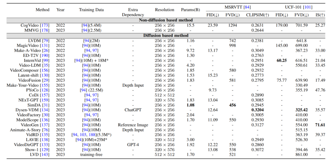 该综述全面细致地总结了 AIGC 时代扩散模型在视频任务上的最新研究,根据研究对象和技术特点,将百余份前沿工作进行了分类和概述,在一些经典的基准(benchmark)上对这些模型进行比较。此外,扩散模型在视频任务领域也还有一些新的研究方向和挑战,如: