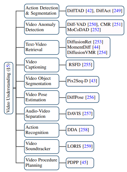 扩散模型在视频领域的应用已远不止传统的视频生成和编辑任务,它在视频理解任务上也展现了出巨大的潜能。通过对前沿论文的追踪,作者归纳了视频时序分割、视频异常检测、视频物体分割、文本视频检索、动作识别等 10 个现有的应用场景。