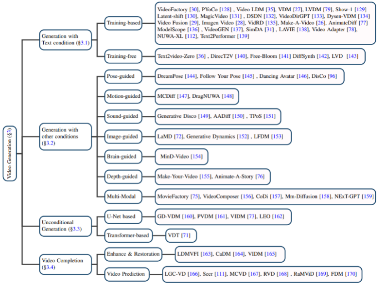 基于其他条件的视频生成:细分领域的视频生成工作。作者将它们归类为基于以下的条件:姿势(pose-guided)、动作(motion-guided)、声音(sound-guided)、图像(image-guided)、深度图(depth-guided)等。