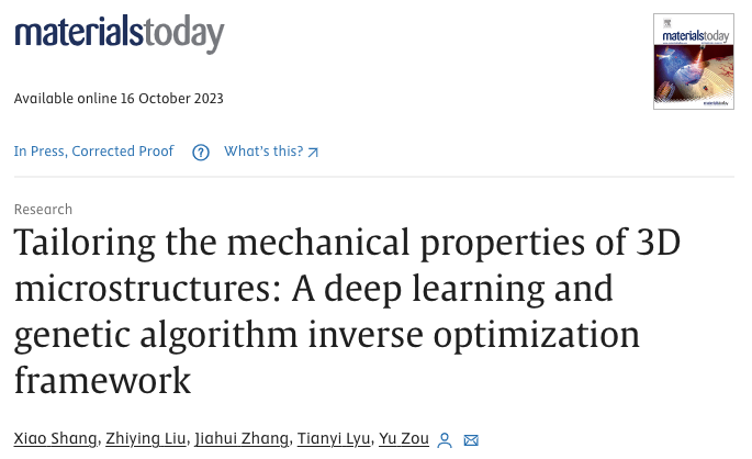 加拿大多伦多大学材料科学与工程系邹宇(Yu Zou)教授课题组利用深度学习算法和基因优化算法创建了一套逆向设计材料3D微观结构的模型。该模型可以准确且快速预测不同材料以及不同3D微观结构在受力后的宏观(Homogenized)和局部(Localized)力学响应,同时可以根据不同应用场景的需求快速逆向设计出最优的材料3D微观结构。该研究展示了深度学习和基因算法在材料设计领域的巨大潜力,同时为加速新材料的研发和设计制造提供了可靠的方法和思路。工作以“Tailoring the mechanical properties of 3D microstructures: a deep learning and genetic algorithm inverse optimization framework”为题,于2023年10月16日发表在 Materials Today。