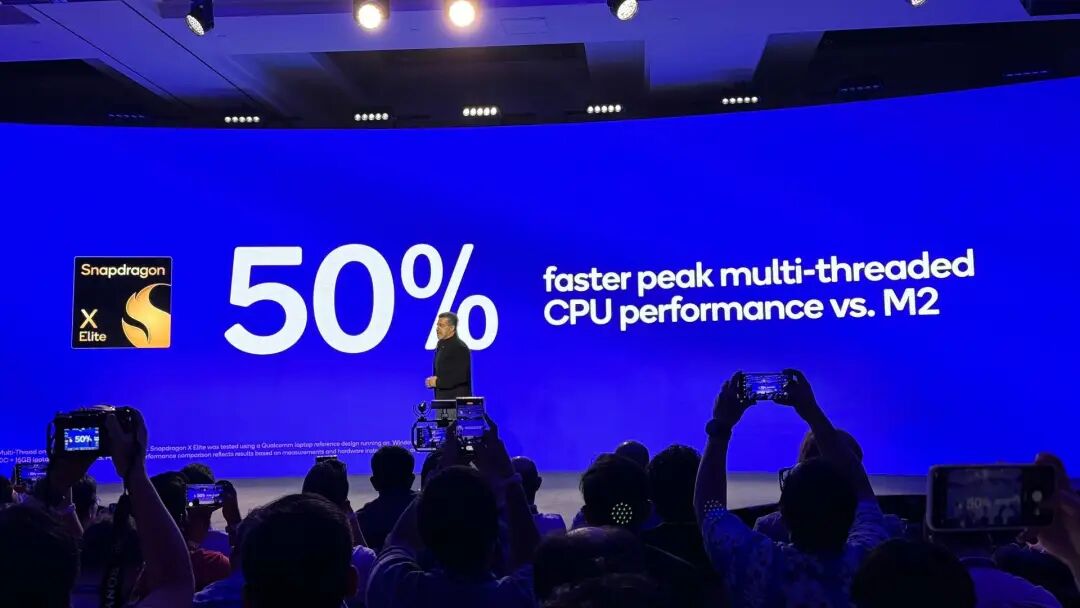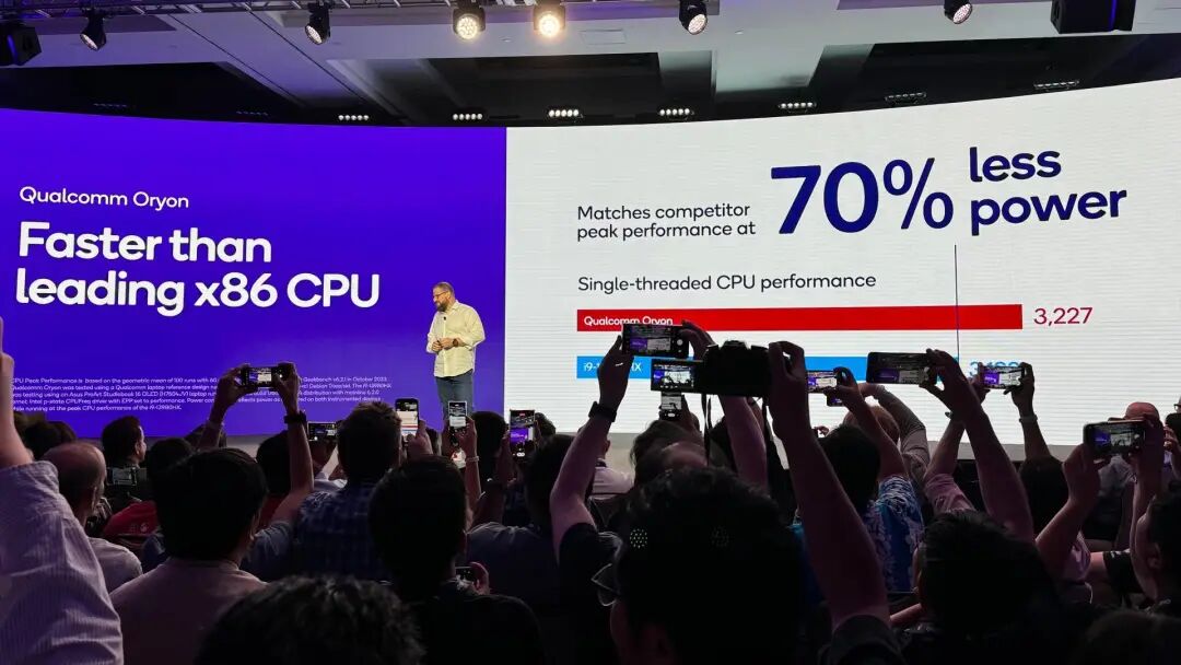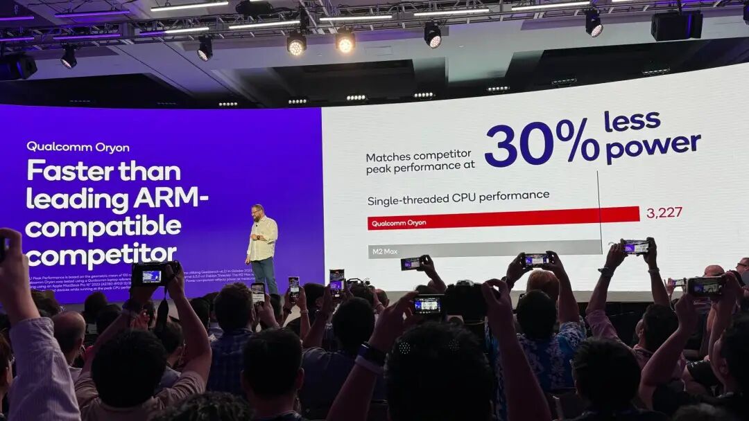 时不我待,比往年的骁龙峰会要更早一个月,2023 骁龙峰会举办时间大幅提前到了 10 月。原因无他,只是 AI 时代的机会稍纵即逝,技术变革不再是以年计算,而是月和日。自去年下半年到现在的 AIGC 热潮来势汹汹,但主要还是集中在桌面领域,尤其是性能强劲的独显台式机,笔记本和手机并非体现 AIGC 魅力的最佳载体。高通在 2023 骁龙峰会上发布的骁龙 X Elite 平台以及第三代骁龙 8 移动平台,则想让大家能在笔记本电脑和手机上也能畅快地使用各种 AIGC 工具,包括 AI 文字生成和 AI 图片生成等等。骁龙 X Elite:比 i9-13980HX 性能更强,比 M2 Max 更省电高通并不是没有尝试过 PC 领域,从早期的移植骁龙 835 芯片到 PC 端,到后来改动更大的骁龙 8cx 芯片,虽然确实功耗比较低,但是问题也不少。比如早期 Windows 跑在 ARM 芯片上的兼容性问题,后来苹果 M 系芯片大放异彩显得骁龙 8cx 不够优秀等等,所以骁龙芯在 PC 领域的存在感一直都不太高。骁龙 X Elite 就是为了改变这种境况而来。先声夺人的跑分环节中,高通 CEO 阿蒙表示,骁龙 X Elite 集成了高通定制的 Oryon CPU,其单线程性能超过了苹果的 M2 Max 和英特尔的 i9-13980HX。更关键的是功耗,在释放峰值性能的时候,Oryon CPU 的功耗比 M2 Max 少 30%,比 i9-13980HX 少 70% 之多。看起来,macOS 和 M 系芯片搭配起来的省电和控温体验,有望在 Windows on ARM 笔记本上实现。不过想必也有人看出来了,高通在比较 CPU 性能的时候,只是对比了单线程性能,到对比多线程性能的时候,高通选择了更弱一些的对手,比如苹果的 M2,和英特尔的 i7-1355U 和 i7-1360P。在和英特尔移动端芯片对比的时候,高通表示 Oryon CPU 不仅性能可达对手的两倍,峰值性能功耗还可以少 68%。至于苹果 M2 的话,高通表示 Oryon CPU 的多线程性能能超过对手 50%,至于此处功耗表现,高通没提。在高通试图平衡性能和功耗矛盾的同时,AI 能力成了骁龙 X Elite 突围的奇兵。可以看到,在骁龙 X Elite 的一图介绍当中,很大一部分是 AI 特性,这些特性包括了可在终端侧运行 130 亿参数大模型,面向 70 亿参数大模型时每秒可生成 30 个 token,整体的 AI 引擎算力达到了 75TOPS,在利用 Stable Diffusion 进行文生图的时候,速度小于 1 秒。第三代骁龙 8:一直提 AI,这次 AI 放到了第一位移动办公一直以来都在真命题和伪命题二者之间反复横跳,之所以出现这样的情况,主要还是手机作为生产力工具,一方面有最强移动性和连接性,但输入和输出能力又远弱于电脑。