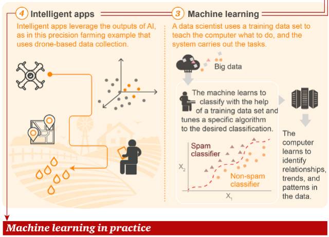与传统编程和统计学方法不同,在机器学习当中,数据科学家使用训练数据“教育”计算机,然后让计算机执行任务。由此,产生了智能应用(Intelligent App)。图中所举的例子是智能农业,通过无人机采集的数据进行精准的施肥、灌溉等操作。