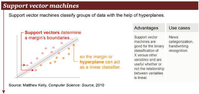 支持向量机(SVM)是二元分类算法。给定一组两种类型的N维的地方点,SVM产生一个(N - 1)维超平面到这些点分成2组。假设你有两种类型的点,且它们是线性可分的。SVM将找到一条直线将这些点分成2种类型,并且这条直线会尽可能地远离所有的点。在规模上,目前使用SVM(在适当修改的情况下)解决的最大的问题包括显示广告、人类剪接位点识别、基于图像的性别检测和大规模的图像分类等等。