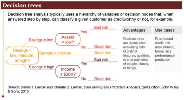 随机森林算法结合了多个树,使用随机挑选的数据子集,以此提升决策树的分析准确率。上图中的例子展示的是与乳腺癌复发相关的不同基因及其几率。随机深林算法的优势在于能够处理大规模数据集,以及大量看似不相关的数据,可以用于风险评估和客户信息分析。