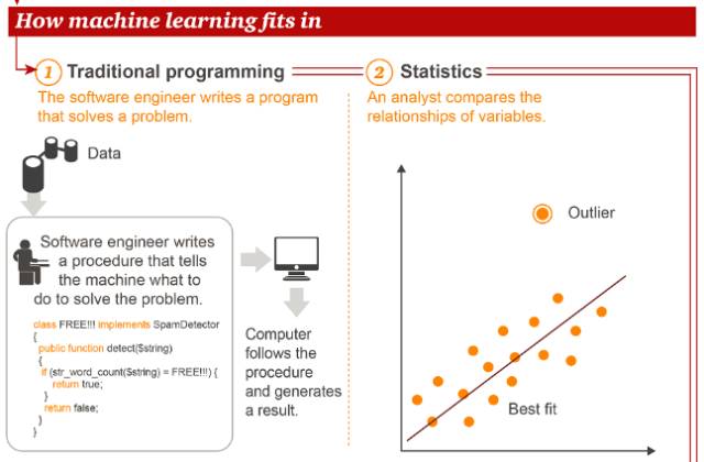 接下来,我们看看机器学习在传统编程、统计学这些常见方法中处于什么样的地位。