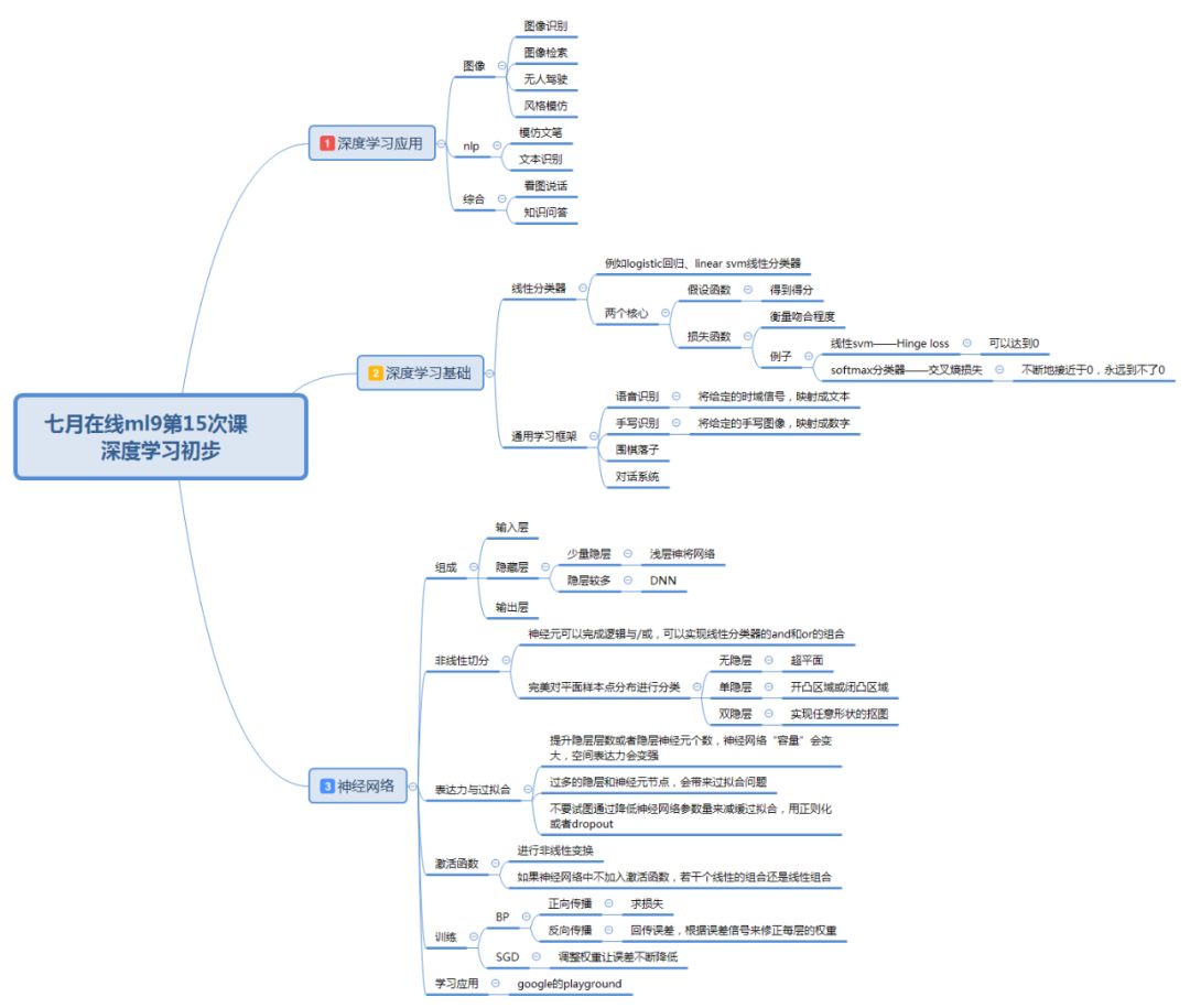 主要包括:深度学习的应用(图像方面和NLP方面)、深度学习基础知识(线性分类器、通用学习框架)以及神经网络的基础知识。具体的思维导图如下所示: