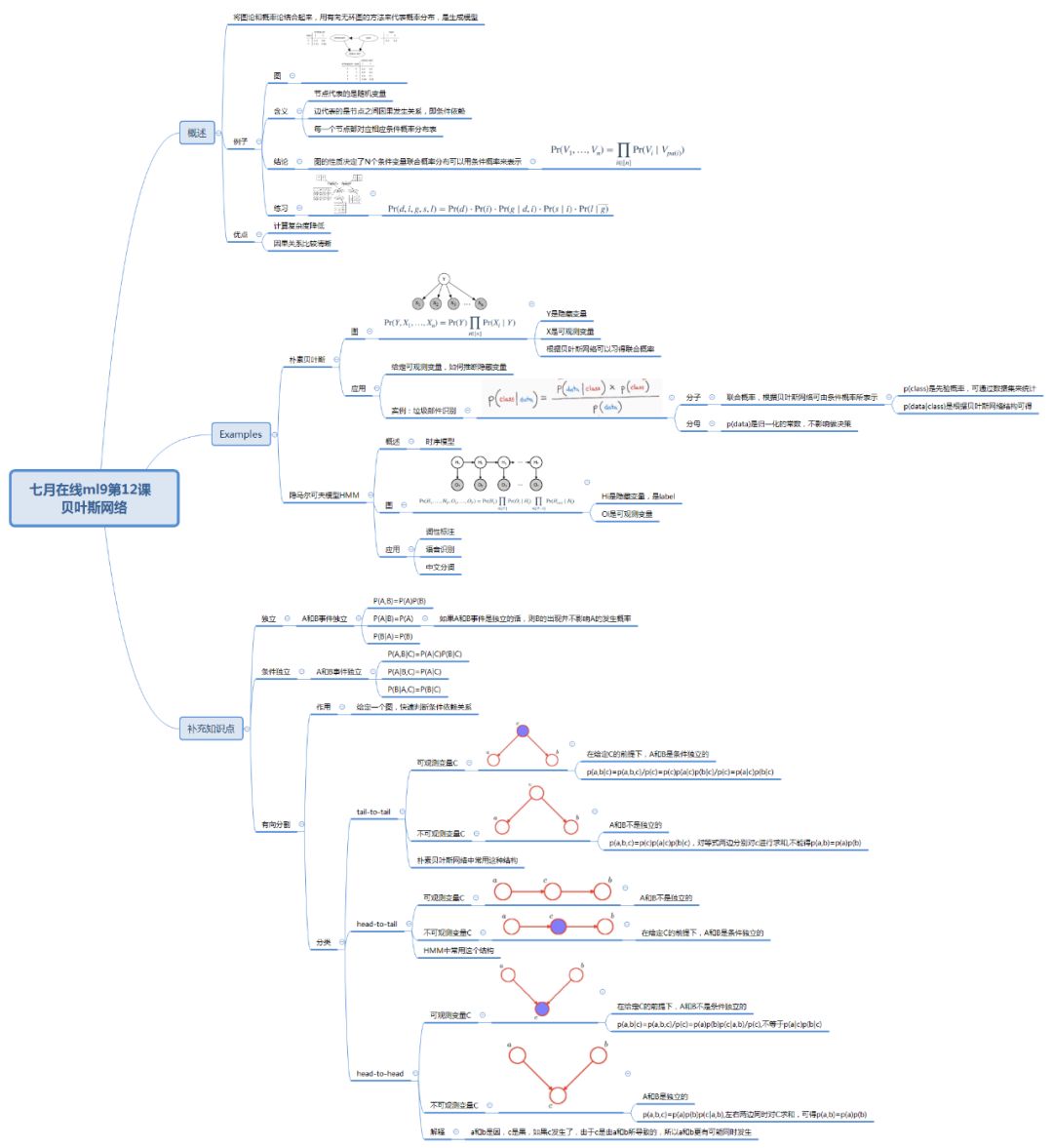 贝叶斯网络是一种信念网,基于有向无环图来刻画属性之间的依赖关系的一种网络结构,并使用条件概率表(CPT)来描述联合概率分布。本导图从网络的概念讲起,为大家介绍了贝叶斯网络的优点、例子(朴素贝叶斯和隐马尔科夫模型),最后又为大家补充了有关条件独立和有向分割的知识点。
