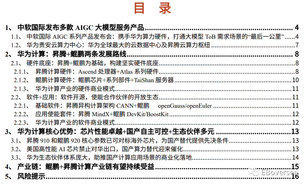 除发布多款AIGC产品及解决方案外,中软国际此次发布会选择在华为全球最大的云数据中心及昇腾云算力枢纽——贵安华为云数据中心举办,我们认为这在一定程度上彰显出中软国际与华为紧密的合作关系,更有效地向市场传达华为AI计算+通用计算全局部署的生态繁荣。