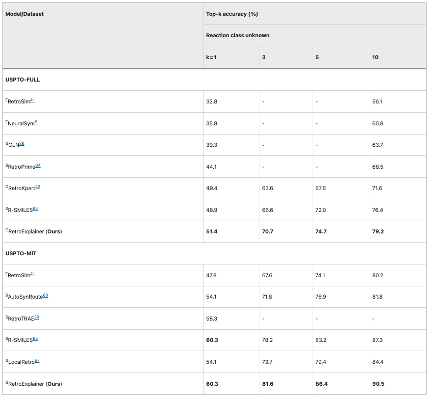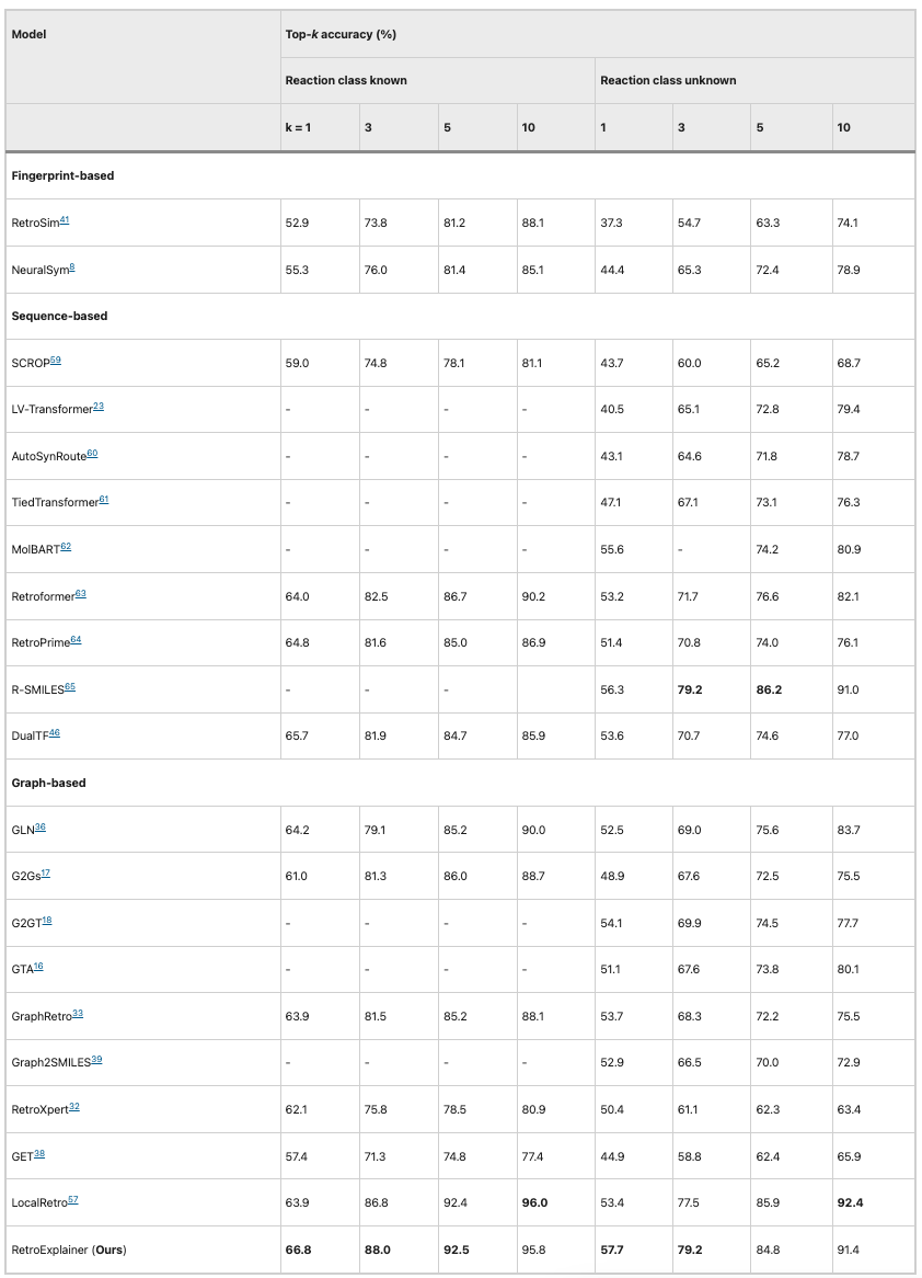 为验证 RetroExplainer 的性能,研究人员基于美国专利及商标局 (USPTO) 收录的化学反应,与其他 21 种逆合成算法进行了对比,评价指标为 top-k 准确率。