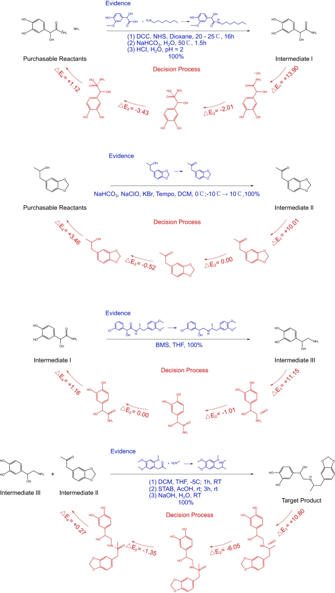 以支气管扩张剂普罗托醇 (Protokylol) 为例,RetroExplainer 为这一产物设计了 4 步的合成路线。随后,研究人员对这 4 步反应进行了文献调研,以探究其可行性。