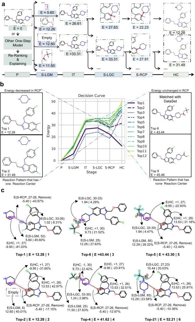 决策模块会基于 5 个逆合成动作和决策曲线的能量分数 (E, Energy Score),将产物转换为反应物,反向模拟分子组装过程。