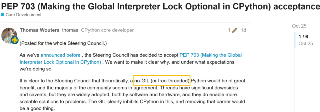PEP 703(Making the Global Interpreter Lock Optional,让全局解释器锁成为可选),简称 no-GIL,也被称为自由线程 (free-threaded)。