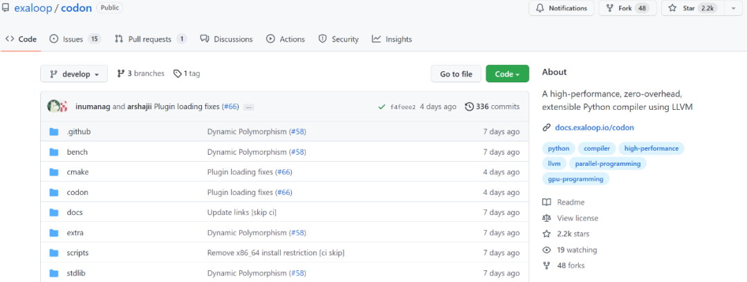 众所周知,Python 是一门简单易学、具有强大功能的编程语言,在各种用户使用统计榜单中总是名列前茅。相应地,围绕 Python,研究者开发了各种便捷工具,以更好的服务于这门语言。编译器充当着高级语言与机器之间的翻译官,不同版本的 Python 编译器已被开发出来,下面我们将为大家介绍一款新的高性能 Python 编译器:Codon。该项目上线短短几天,已收获 2.2k 星。项目地址:https://github.com/exaloop/codon作为高性能 Python 编译器,Codon 可将 Python 代码编译为本机机器代码,而无需任何运行时开销。在单线程上,Python 的典型加速大约为 10-100 倍或更多。Codon 的性能通常与 C/C++ 的性能相当。与 Python 不同,Codon 支持本机多线程,这可以使速度提高很多倍。Codon 可通过插件基础结构进行扩展,它允许用户合并新的库、编译器优化甚至关键字。Codon 框架是完全模块化和可扩展的,允许无缝集成新模块、编译器优化、领域特定语言等,并积极为生物信息学和量化金融等多个领域开发新的 Codon 扩展。