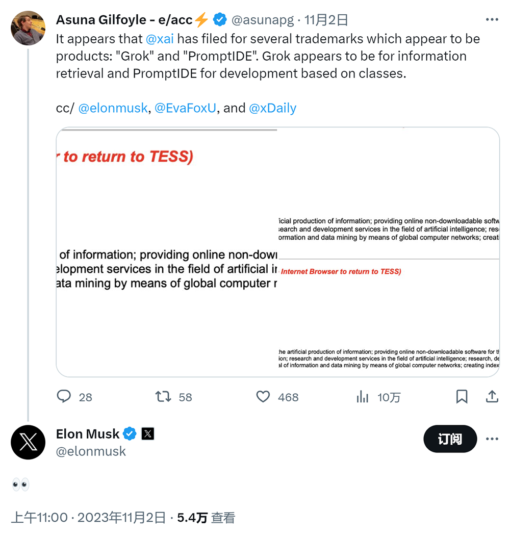 据量子位报道,11月2日,网友@asunapg在社交媒体X上爆料马斯克xAI团队首批产品信息:Grok,与AI信息检索相关;PromptIDE,字面理解是“提示词工作站/集成开发环境”。该网友称,他发现xAI已提交这两个商标申请。而马斯克现身评论区,回复了一个表情符号,并没有否认。