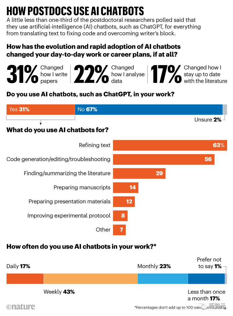 在《Nature》对全球的博士后进行的调查表明,有三分之一的的受访者正在使用AI聊天机器人来帮助自己修改文字、生成或编辑代码、整理相关领域的文献等工作。