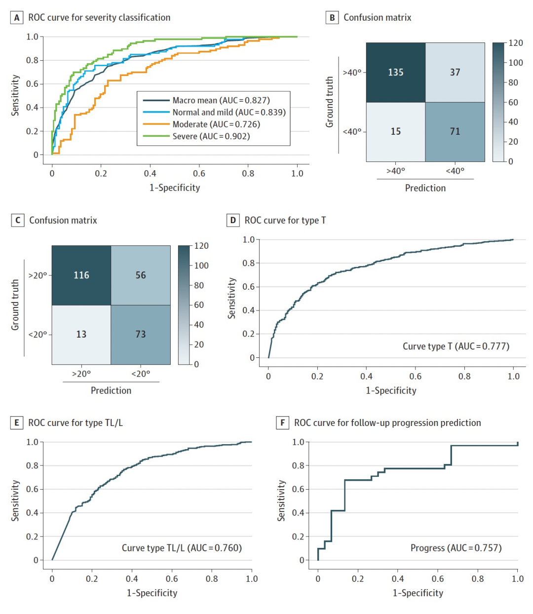 对于使用该应用程序进行随访的患者中的曲线进展的区分,该模型的预测准确性为70.49%(95%CI,57.43%-81.48%),AUC为0.757(95%CI,0.630-0.858),敏感性为63.33%(95%CI,43.86%-80.87%),负预测值为68.57%(95%CI,56.78%-78.37%)。对于进展评估并对放射图像进行蒙眼评估的经验丰富的脊柱外科医生,他们能够以70.00%的准确性、77.42%的敏感性和72.00%的负预测值区分进展性曲线。初级外科医生表示,他们无法区分具有进展性畸形的患者(表3)。