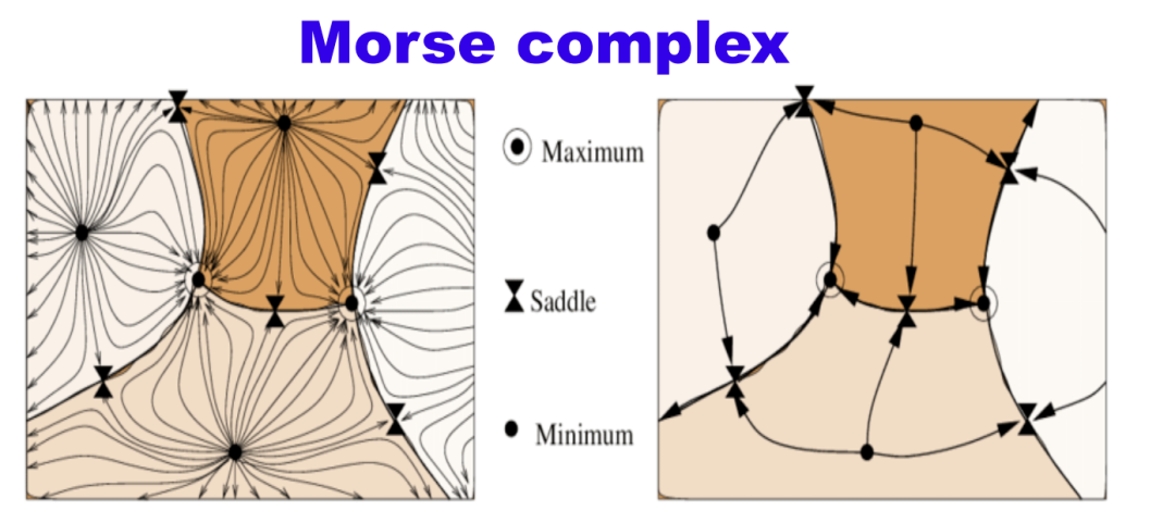 2)高阶相互作用:图主要描述两两之间的相互作用,而通过引入“更高维度的单元”,单纯复形能够表达出超过两个实体之间的相互作用。例如,填充的三角形表示三个实体之间的相互作用,填充的四面体表示四个实体之间的相互作用。注意二者的区别,用一个形象的比喻来解释:图可以表示父亲与孩子的关系,以及母亲与孩子的关系;而复形则能表示父亲、母亲、孩子三者组成的家庭单位的关系,用一个填充的二维三角形。3)距离和体积的描述:图通常只能描述路径或距离,单纯复形则可以描述面积,两边夹角(2维单元)或者体积(3维单元)。这为我们提供了更高阶的信息,使我们能够捕获到实体间更复杂的相互作用。举个简单的例子,从一组点和固定距离构造一个复形(Vietoris-Rips复形):或者复杂些,在微分拓扑中,根据函数导数取值0的信息及其正定性将流形分片(Morse复形):