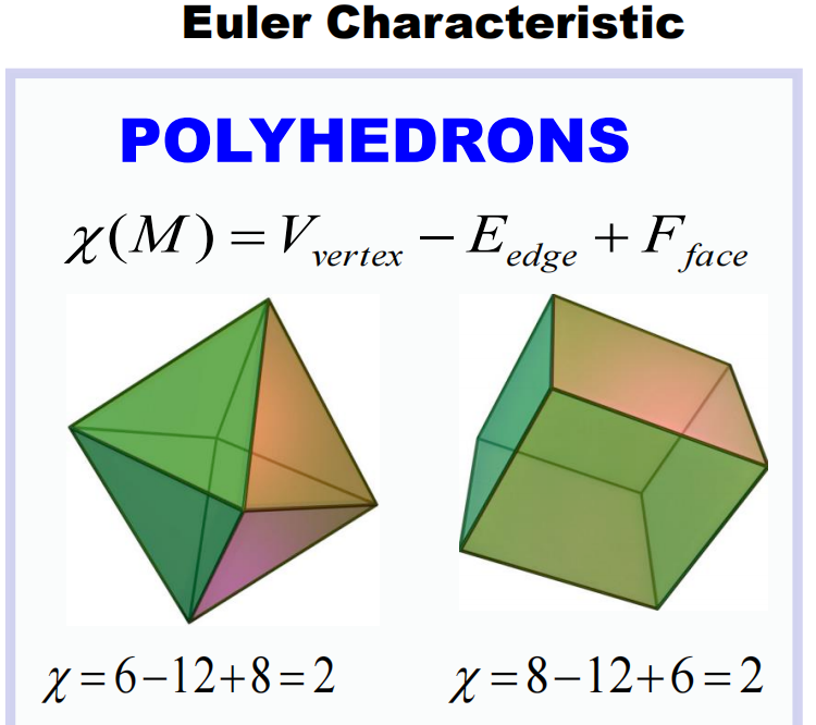 1)欧拉示性数:欧拉示性数取值为“顶点数 减去 边数 加上 面数”(V-E+F)。对于拓扑等价于球体的多面体(例如立方体或八面体等),欧拉示性数均为2。这是因为在拓扑意义上,这些形状都可以被连续地变形为球形。