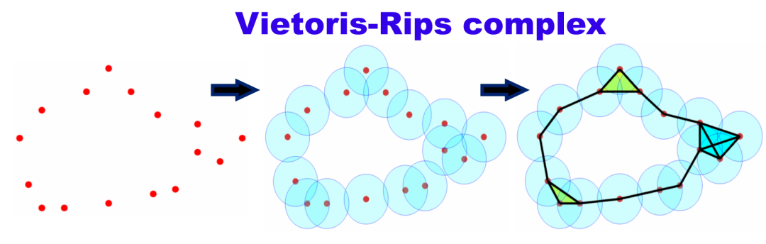 上图最左边的十四个点代表原始数据,每点周围有一个球体,随时间推移,这些球体的半径增大。当两个球体接触时,表示两个数据点之间存在连接,这就形成了一条边,同时独立分支的数量减一。在过滤流过程中,随着球体半径的增大,独立元素逐渐减少,同时出现新的拓扑结构(比如环和更高维的洞)。从图中的条形码可以看出,初始有14个独立节点,所以 Betti0 为 14 个。随着时间的推移,球体之间的连接增多,独立的节点数目减少。同时,当出现闭合的路径时,就形成了环,可以在 Betti1 的条形码中看到这种变化。图12. Vietoris-Rips 复形与单纯复形通过过滤流过程和单纯复形,我们可以从全局和多尺度的角度理解复杂系统的结构,并通过 Betti 数这类拓扑不变量来量化这些性质。这种方法在机器学习、迁移学习等领域有着重要的应用,相比传统的统计工具,它提供了对数据深层本质结构的理解。