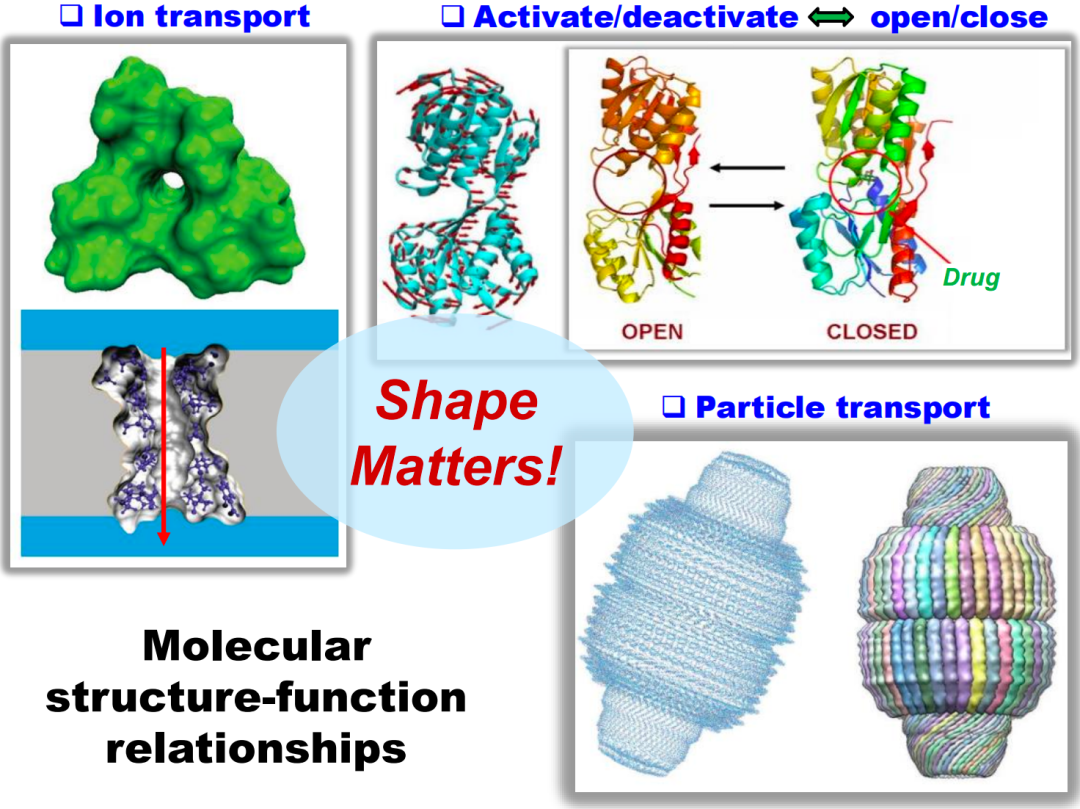 除此之外,还有几何方法,例如将原子看作半径固定的球体,观察者可以从球体集合的外部,即分子的表面进行研究,查看其表面积或凸凹区域。这些凸凹区域与原子间的相互作用信息有关,这种描述更偏向几何。更进一步,还可以通过密度泛函理论来计算电子密度或电子函数分布,将分子数据转化为一种空间形态的数据表现形式。因此,尽管源自同样的分子数据,我们可以从多个角度对其进行表征。一旦完成表征,就可以在此基础上提取各种特性,包括各种指纹(fingerprint)和描述符(descriptor)等等。这些性质可能和最终想要理解的功能产生联系,例如水溶性、脂溶性、毒性等。在构建关于分子功能模型的过程中,大量使用了结构数据。这是因为分子的结构和其功能之间存在强烈的关系,被称为“结构-功能关系”(Structure-Function Relationship)。例如,离子通道蛋白质的显著特点是它们中心有一个洞(图4左上),这个洞对离子通道的功能至关重要,因为它方便了细胞膜外部的离子进入膜内,或者膜内的离子离开细胞。另一个例子是蛋白质笼(图4右下),这种蛋白质的表面有一定结构,但其内部是空的,就像用来装东西的盒子,这种空心的结构有利于某些物质的存储和运输。最后一个例子是具有两个固定区域,并通过一个灵活连接区域相连的分子。这种结构可以形成一种开关状态,使得分子能够处于激发态或非激发态,从而影响其功能。无论是通过共价键连接还是通过非共价键的相互作用,都会影响最终的稳定态结构,这种稳定态结构与分子功能紧密相关。因此,描述分子的结构对于理解分子功能具有重要作用。为更好地描绘分子的结构,大量的描述符(无论是组合量,代数量还是几何量)被提取了出来。在这些描述符中,有一些关注拓扑特性,比如图上向量、几何量等等,还有一些关注组合或邻近信息的指纹。在大量关于结构的描述量中,可能存在某些更本质、更全局的量,它们能够更好地抓住结构的整体信息,从而在理解和描绘分子的功能方面起到更重要的作用。这就引出了拓扑数据处理的核心:通过拓扑不变量来描述数据。