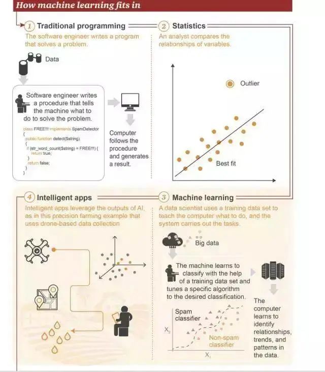 ①传统编程:软件工程师编写程序来解决问题。首先存在一些数据→为了解决一个问题,软件工程师编写一个流程来告诉机器应该怎样做→计算机遵照这一流程执行,然后得出结果;③机器学习:数据科学家使用训练数据集来教计算机应该怎么做,然后系统执行该任务。首先存在大数据→机器会学习使用训练数据集来进行分类,调节特定的算法来实现目标分类→该计算机可学习识别数据中的关系、趋势和模式;④智能应用:智能应用使用人工智能所得到的结果,如图是一个精准农业的应用案例示意,该应用基于无人机所收集到的数据。