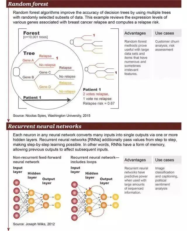 6. 随机森林(Random forest):随机森林算法通过使用多个带有随机选取的数据子集的树(tree)改善了决策树的精确性。本例在基因表达层面上考察了大量与乳腺癌复发相关的基因,并计算出复发风险。- 优点:随机森林方法被证明对大规模数据集和存在大量且有时不相关特征的项(item)来说很有用