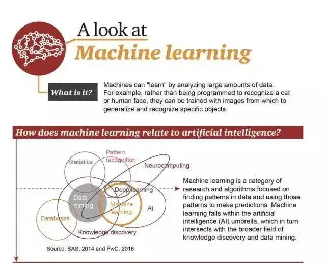 机器通过分析大量数据来进行学习。比如说,不需要通过编程来识别猫或人脸,它们可以通过使用图片来进行训练,从而归纳和识别特定的目标。机器学习是一种重在寻找数据中的模式并使用这些模式来做出预测的研究和算法的门类。机器学习是人工智能领域的一部分,并且和知识发现与数据挖掘有所交集。