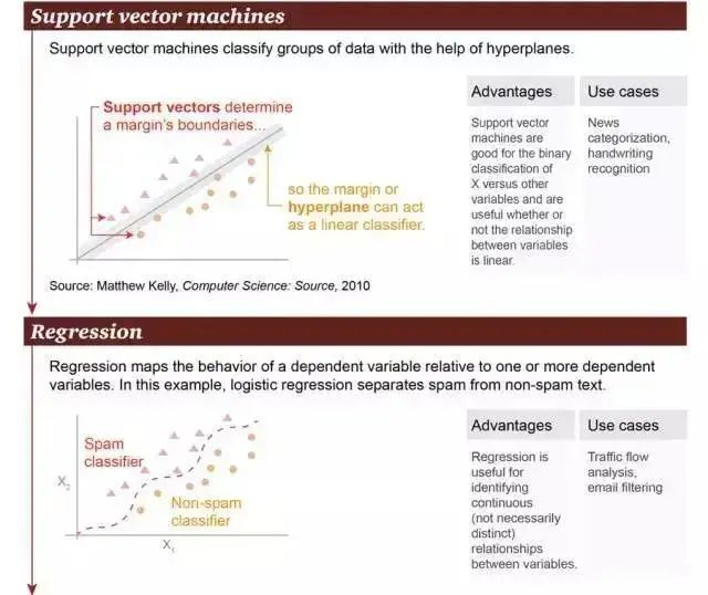 3. 回归(Regression):回归可以勾画出因变量与一个或多个因变量之间的状态关系。在这个例子中,将垃圾邮件和非垃圾邮件进行了区分。- 优点:回归可用于识别变量之间的连续关系,即便这个关系不是非常明显