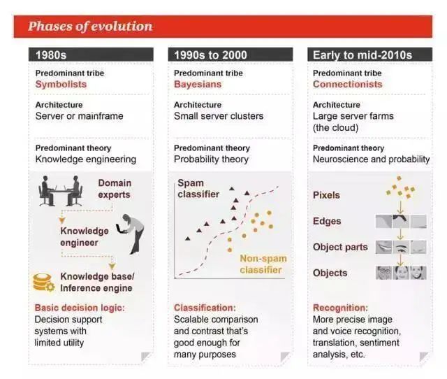 几十年来,人工智能研究者的各个「部落」一直以来都在彼此争夺主导权,参阅机器之心文章《华盛顿大学教授 Pedro Domingos:机器学习领域五大流派(附演讲 ppt)》。现在是这些部落联合起来的时候了吗?他们也可能不得不这样做,因为合作和算法融合是实现真正通用人工智能(AGI)的唯一方式。这里给出了机器学习方法的演化之路以及未来的可能模样。①符号主义:使用符号、规则和逻辑来表征知识和进行逻辑推理,最喜欢的算法是:规则和决策树②贝叶斯派:获取发生的可能性来进行概率推理,最喜欢的算法是:朴素贝叶斯或马尔可夫③联结主义:使用概率矩阵和加权神经元来动态地识别和归纳模式,最喜欢的算法是:神经网络④进化主义:生成变化,然后为特定目标获取其中最优的,最喜欢的算法是:遗传算法⑤Analogizer:根据约束条件来优化函数(尽可能走到更高,但同时不要离开道路),最喜欢的算法是:支持向量机