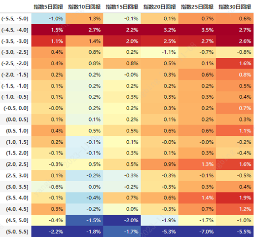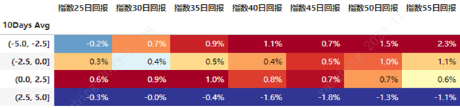 可以看到,在25日~55日的全部维度下,当指标达到2.5%以上时,转债指数都有负面的预期。虽然数据显示了当数值较低时,市场回报也更高,但这并不是我们设计这个指标的初衷。因此实操中一般只关注是否触及上方的预警线(2.5%附近)。