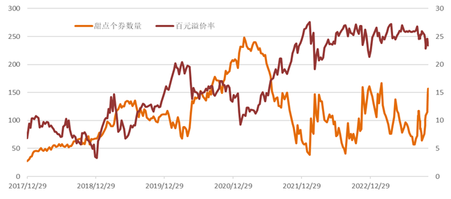 在上周周报中我们也有提及,出自《被遗忘的theta》。简单看,“甜点”是期权定价的视角下,性价比较高、容易获利的品种。这个指标我们可以通过观察数量,来评价彼时转债市场的难易程度。下图摘自上周周报。