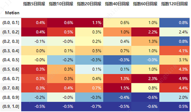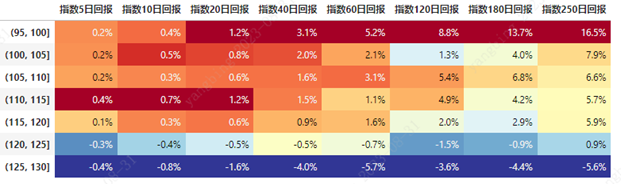 择时意义上这是一个偏长期的指标。不难看出,在40日以下维度,这个指标的择时效力非常微弱。从120日维度开始显示明显而单调的效果,也就是:1、如果仅着眼于1~2个月的短期回报,这个指标的高低并无强烈的择时意义;2、但考虑半年持有、1年持有的中长期表现,这个指标的决定力很强。