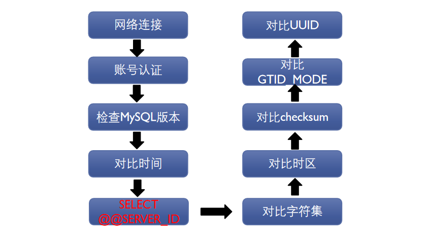 通过抓取消息和分析代码,发现 MySQL 从库和主库建立同步通道过程中,分别进行网络连接建立、授权,实例唯一性、时钟、字符集、binlog 配置校验等工作。其中实例唯一性校验过程从库会获取主库的 server id。