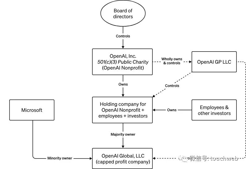 为保持初心,OpenAI没直接转换成营利公司,而是做了一个新的“限制营利”结构——拆出一个营利性的子公司,还接受微软和其他资方股权投资,但子公司受非营利组织控制(51%股权),而非营利组织受董事会控制。
