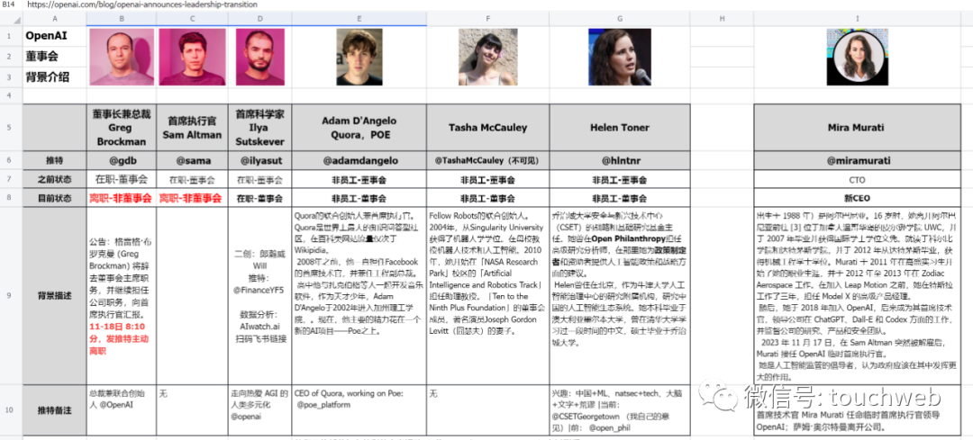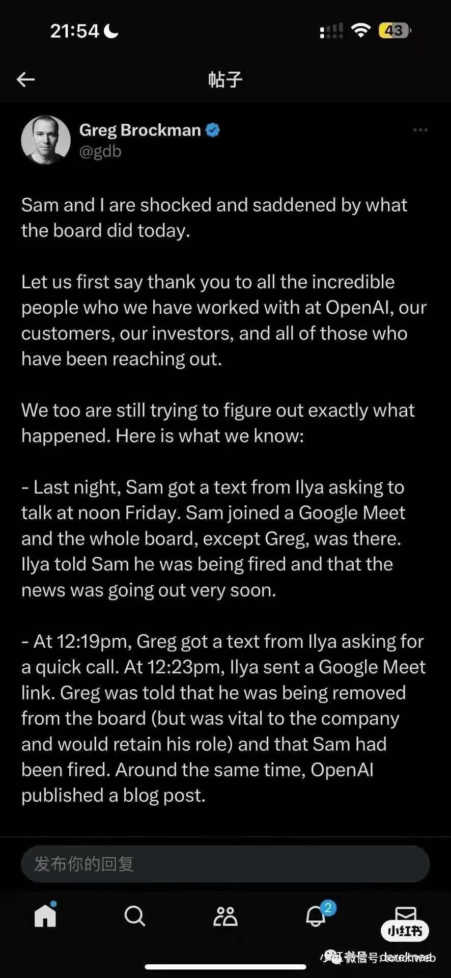 - 中午12:19,Greg收到Ilya发来的短信,要求快速打电话。中午12:23,Ilya发送了一条 Google Meet链接。Greg被告知,他将被从董事会中除名(但对公司至关重要,并将保留Greg的职位),而Sam已被解雇。大约在同一时间,OpenAI 发表了一篇博文。