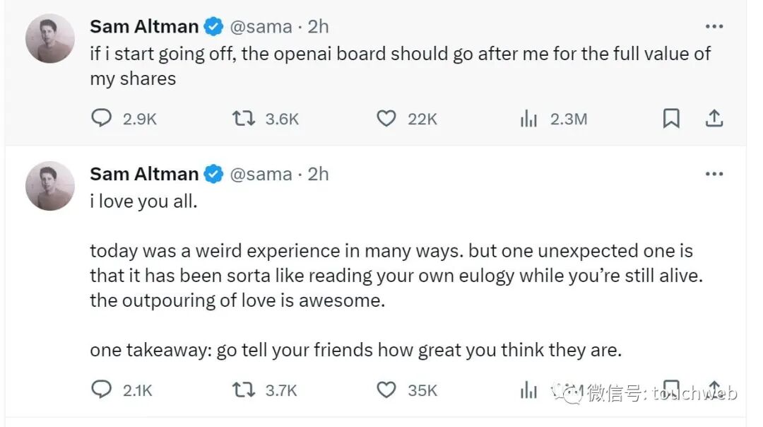 谈及被解雇一事时,Sam Altman说,今天在很多方面都是一次奇怪的经历。但令人意想不到的是,这有点像在你还活着的时候读你自己的悼词。爱的倾注真是棒极了。