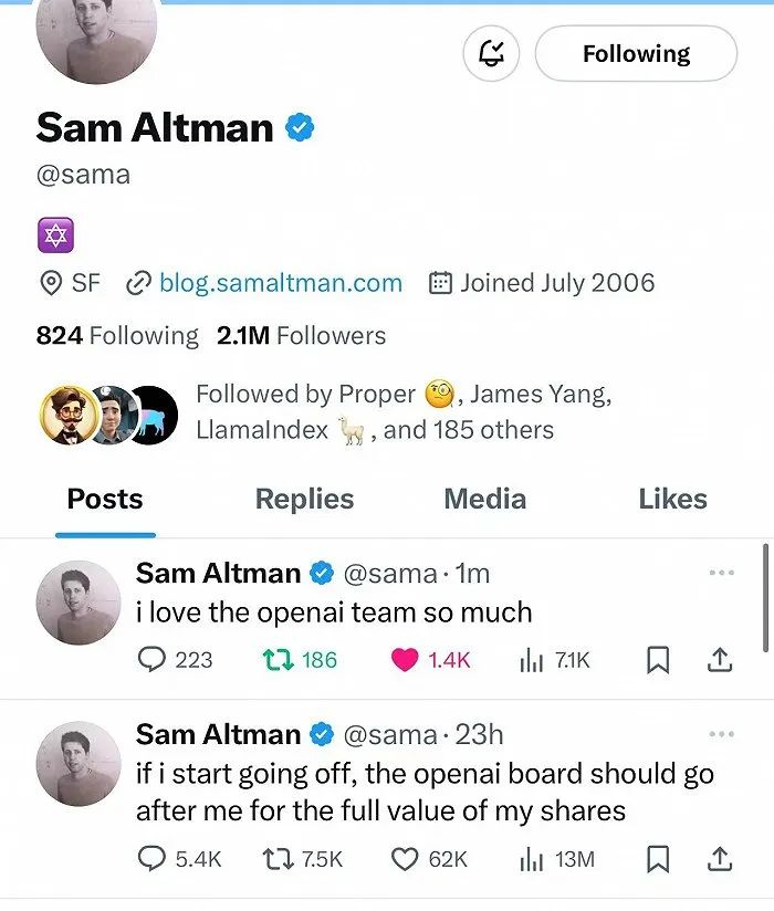近日,OpenAI董事会解雇阿尔特曼在内部引发巨大地震,总裁布罗克曼、多位高管以及很多OpenAI员工,在得到消息后选择辞职。据最新报道,OpenAI董事会意让阿尔特曼重返CEO职位。多方消息显示,因为“投资人的怒火”,OpenAI董事会才在一天时间里来了个大反转。在OpenAI董事会解雇阿尔特曼前,如Khosla Ventures(风投公司)和领英联创、OpenAI前董事会成员Reid Hoffman等都没有提前收到通知。甚至连拥有OpenAI 49%股份的微软,也是在公告发布前5-10分钟才收到消息。微软CEO纳德拉被曝在得知阿尔特曼离职后“非常愤怒”,同时一些主要投资者也考虑对董事会提起诉讼。阿尔特曼周日在𝕏上发布的推文显示,他是佩戴访客证件进入的公司,这让他很不爽。“这是我第一次,也是最后一次戴这玩意。”据外媒消息,阿尔特曼为自己的回归开出了条件,其中包括设立一个新董事会。还有消息说阿尔特曼考虑的另一个选择是创办一家由OpenAI前员工组成的新公司。(三言科技)Meta增强现实软件负责人离职,AR眼镜项目遭遇挫折