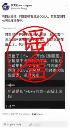 1、阿里辟谣裁员两万五千人